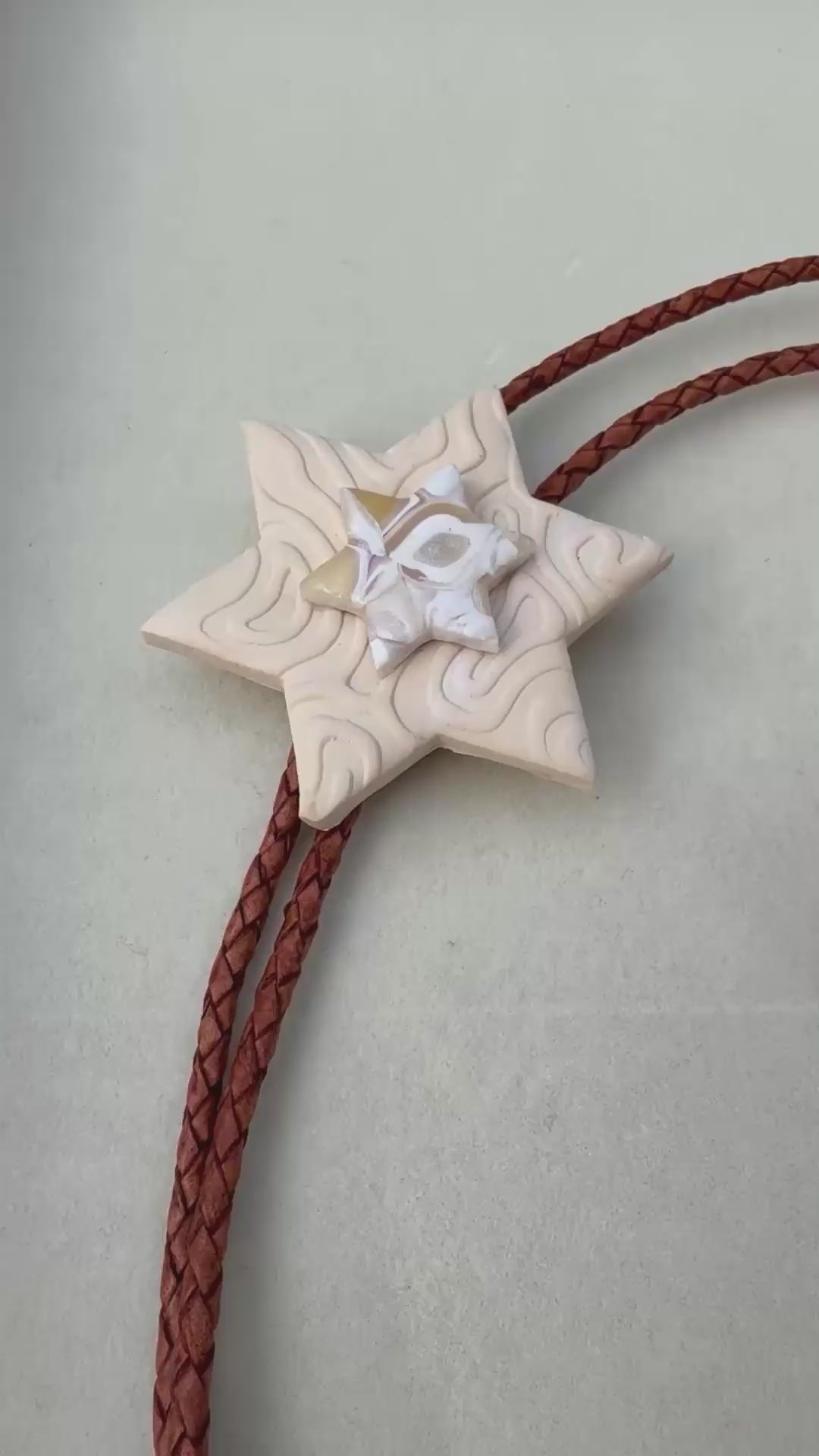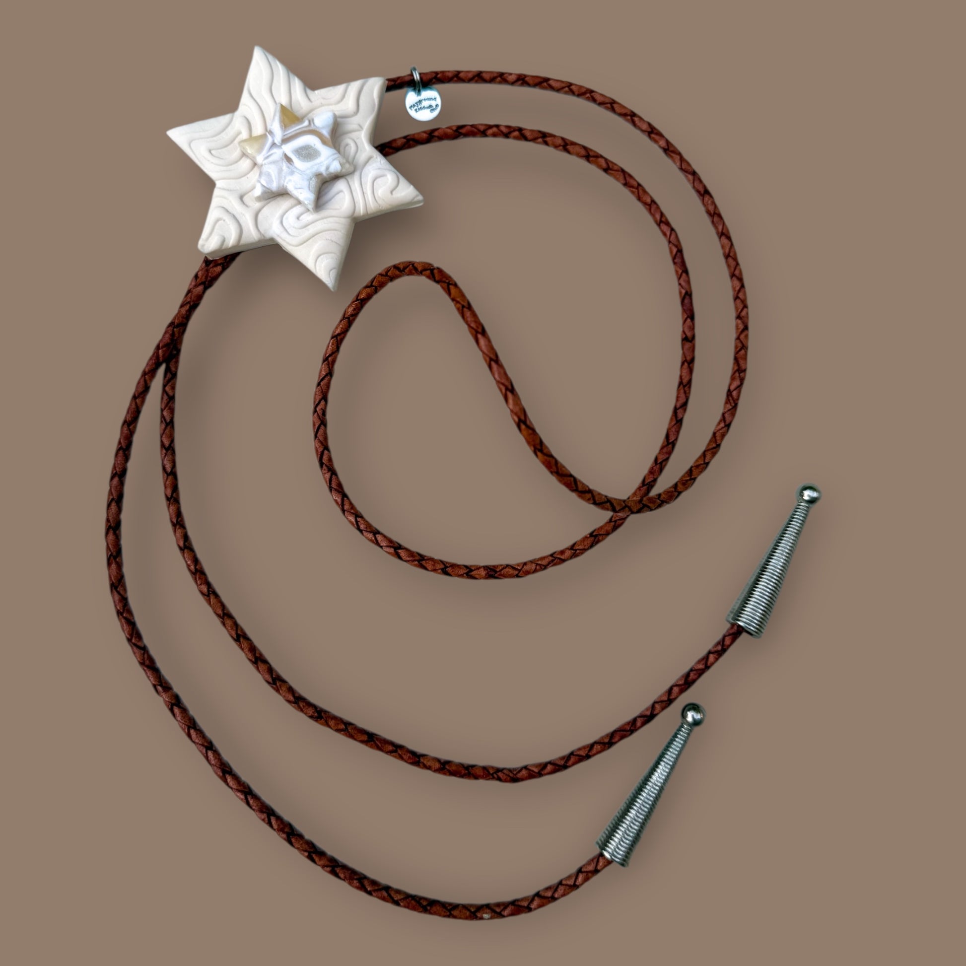 Meet Ori: large carved stone style Magen David made of polymer clay with a smaller Magen David in the style of agate and dolomite gemstone with a stainless steel adjustable back on braided brown leather cord with silver color bolo tips.