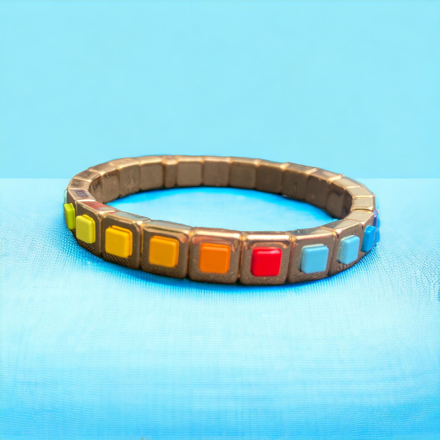 The Gordon Beach Stretch Bracelet showcases a kaleidoscope of hues, from ocean blues and seafoam greens to sandy yellows and sunset oranges.